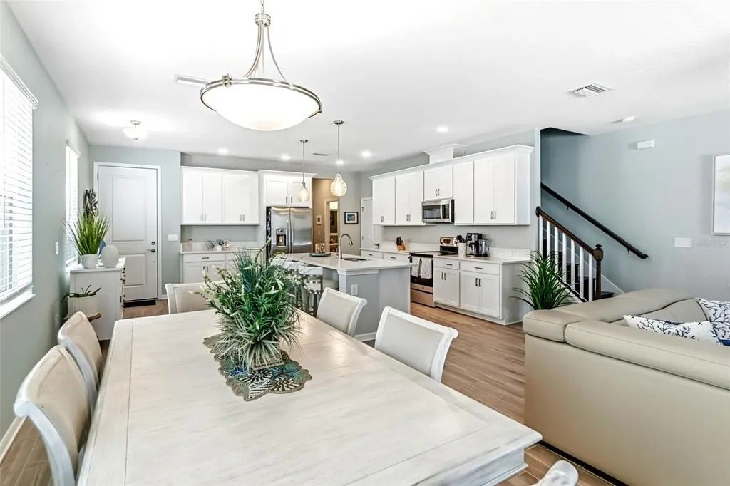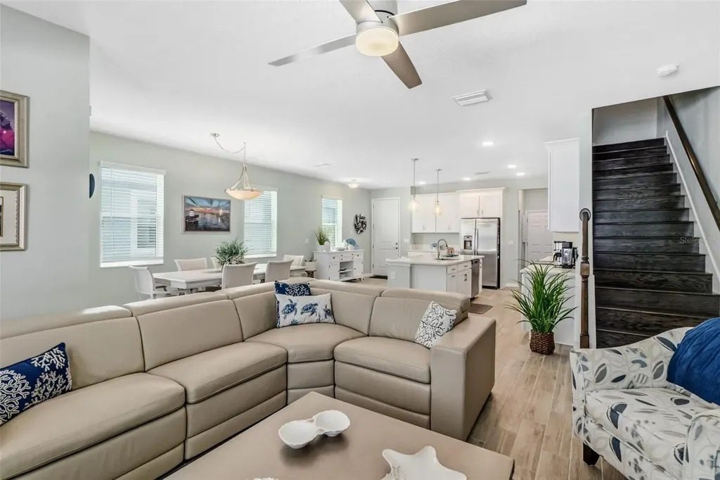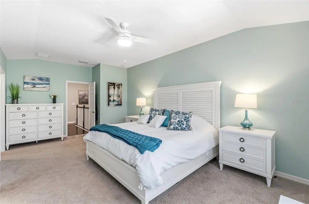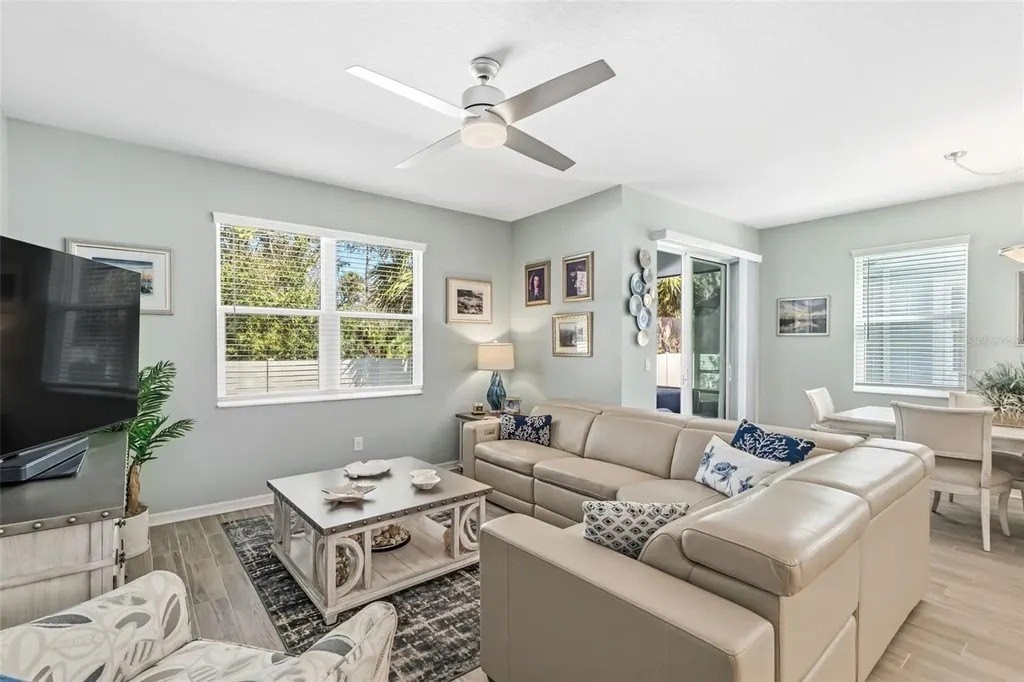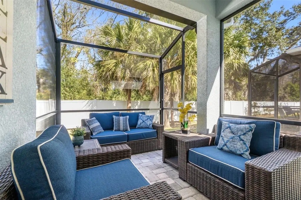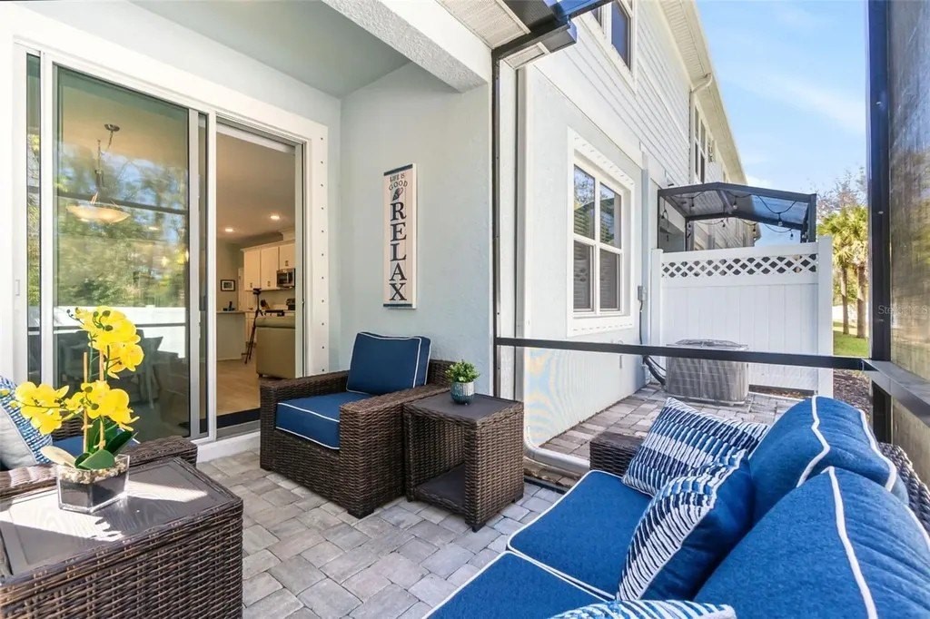 This beautifully maintained 3-bedroom, 2.5-bath home features an open-concept floor plan that feels fresh, bright, and seamlessly blends modern design with coastal charm-inviting from the moment you step inside. The entry, lined with a paver driveway and sidewalks, leads into a home that offers both style and functionality. The spacious, light-filled living area flows effortlessly into the dining and kitchen spaces, making it ideal for entertaining. The dream kitchen boasts a stunning breakfast island, gleaming finishes, and ample seating space for hosting friends and family. Relax on the screened and covered lanai, perfect for unwinding while enjoying the tranquil setting and mature trees that provide privacy. Upstairs, you'll find a versatile loft space suitable for a media room, office, or play area. The split floor plan offers guest bedrooms and a guest bath designed for comfort and privacy. The luxurious primary suite features a spacious walk-in closet and a spa-inspired bathroom. Additional conveniences include an epoxy-coated garage floor and a large interior laundry room. Located just a short walk to the community pool, this home offers the perfect balance of resort-style living and everyday practicality. Whether hosting gatherings or enjoying quiet evenings on the lanai, this property truly has it all. Don't miss this rare opportunity to own a move-in-ready coastal retreat in a peaceful, private setting!