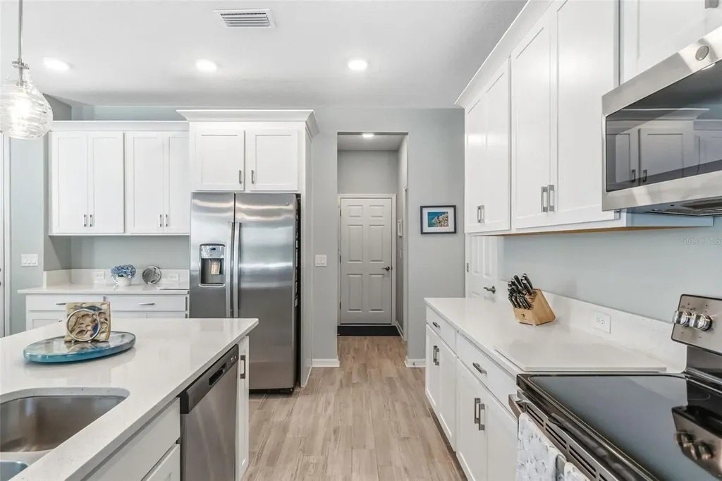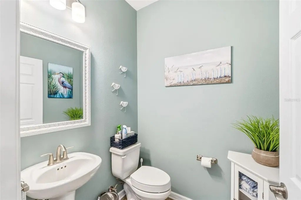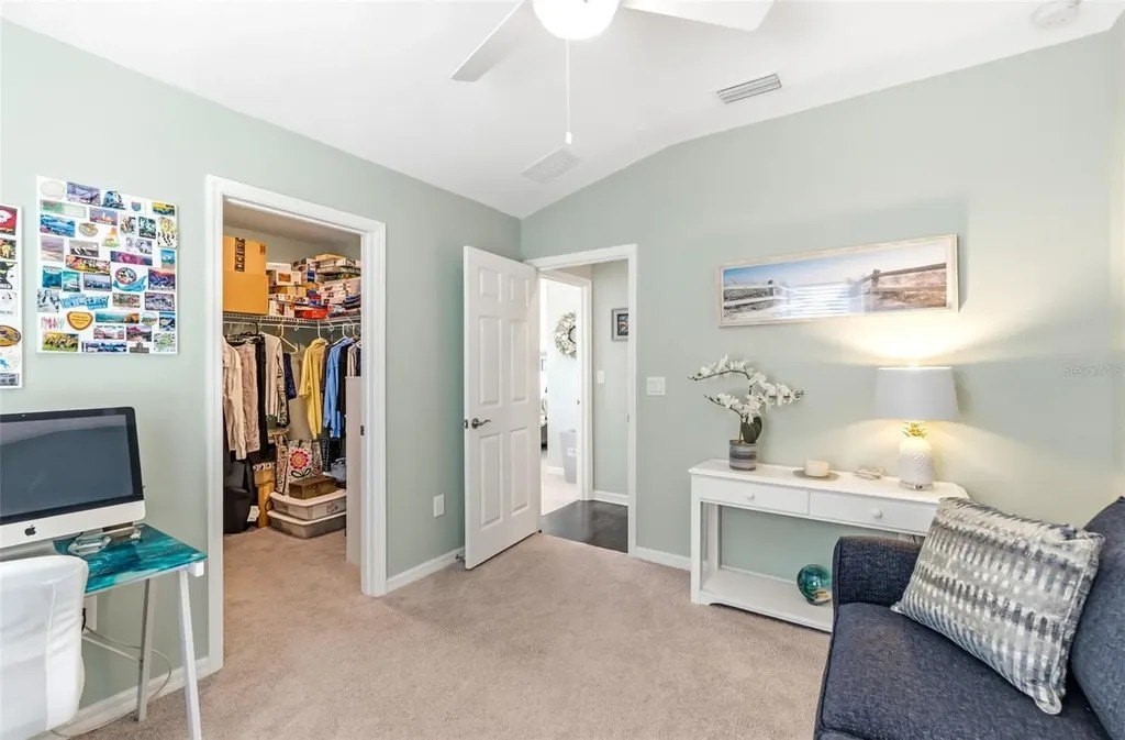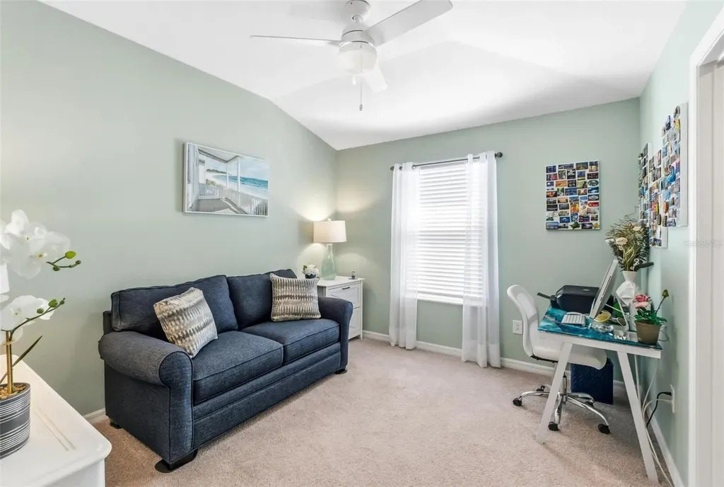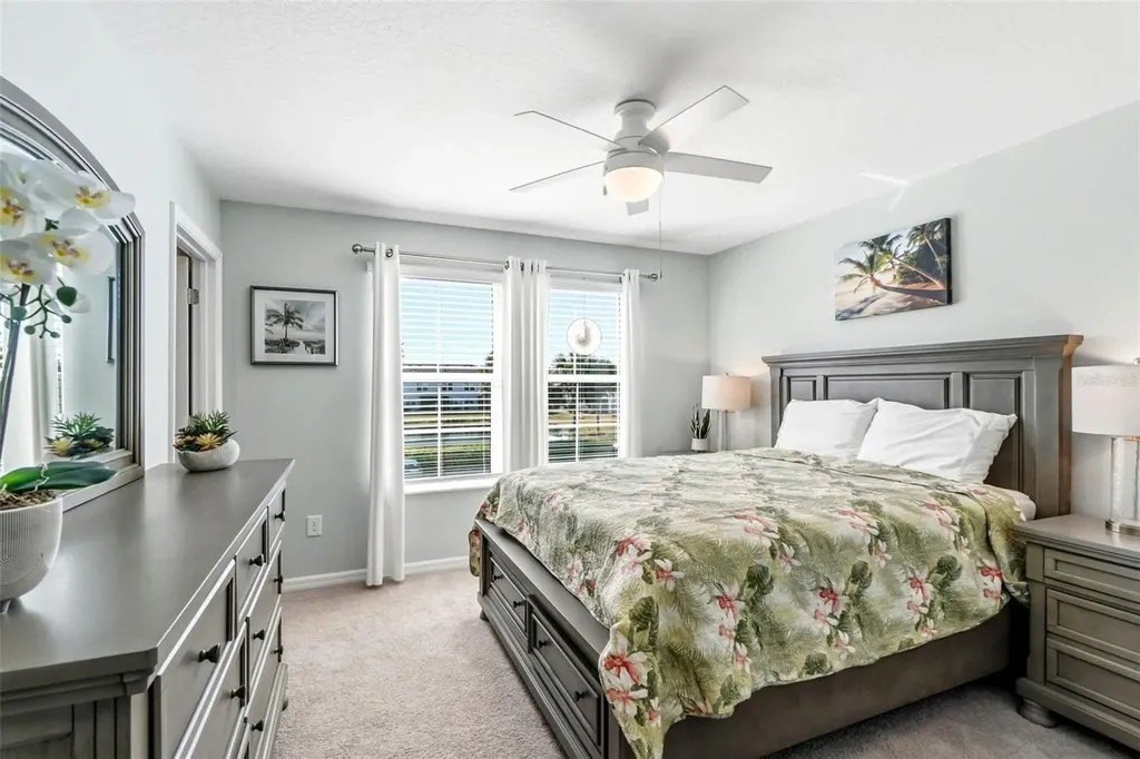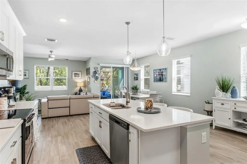 This beautifully maintained 3-bedroom, 2.5-bath home features an open-concept floor plan that feels fresh, bright, and seamlessly blends modern design with coastal charm-inviting from the moment you step inside. The entry, lined with a paver driveway and sidewalks, leads into a home that offers both style and functionality. The spacious, light-filled living area flows effortlessly into the dining and kitchen spaces, making it ideal for entertaining. The dream kitchen boasts a stunning breakfast island, gleaming finishes, and ample seating space for hosting friends and family. Relax on the screened and covered lanai, perfect for unwinding while enjoying the tranquil setting and mature trees that provide privacy. Upstairs, you'll find a versatile loft space suitable for a media room, office, or play area. The split floor plan offers guest bedrooms and a guest bath designed for comfort and privacy. The luxurious primary suite features a spacious walk-in closet and a spa-inspired bathroom. Additional conveniences include an epoxy-coated garage floor and a large interior laundry room. Located just a short walk to the community pool, this home offers the perfect balance of resort-style living and everyday practicality. Whether hosting gatherings or enjoying quiet evenings on the lanai, this property truly has it all. Don't miss this rare opportunity to own a move-in-ready coastal retreat in a peaceful, private setting!